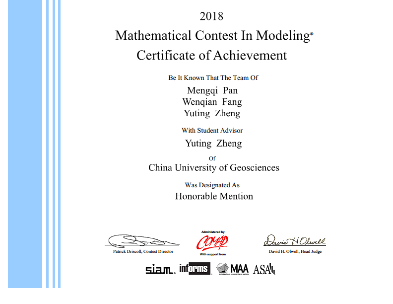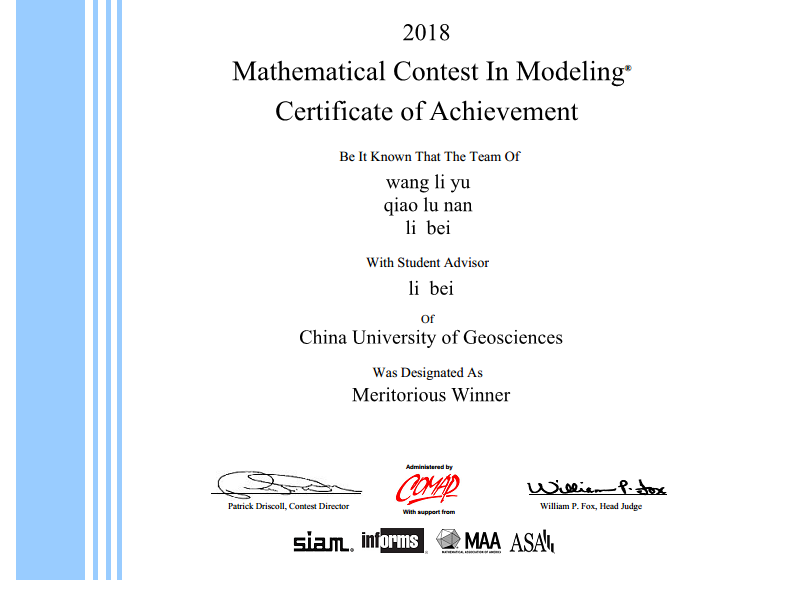 在与众多名校参赛队的激烈角逐中,我校成人影院 三名同学李贝(2016级硕士计算机科学与技术专业)、乔璐楠(2016级硕士计算机科学与技术专业)、王利宇(2017级硕士计算机科学与技术专业)获得了该项赛事一等奖(Meritorious Winner)。另外,成人影院 潘孟琦(2016级硕士计算机科学与技术专业)、数理学院方文倩(2017级硕士信号处理与智能计算)、成人影院 郑雨婷(2017级硕士计算机科学与技术专业)三位同学获该项赛事二等奖(Honorable Mention)。