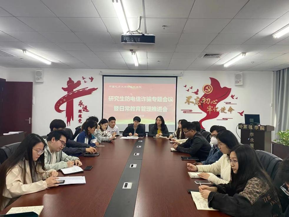 首先,傅苑针对学院研究生特点,结合近期发生的多起电信诈骗事件,希望研究生骨干深入落实防电信诈骗宣传和提醒工作,对于任何有电信诈骗可能性的电话和信息,做到不信、不听、不转账,提高自身防范意识。同时,傅苑通过对比近3年研究生同期就业率,分析当前计算机行业就业形势的严峻性和紧迫性,提醒研究生提前做好职业规划和就业求职准备。