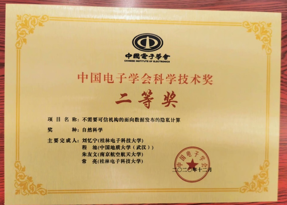 (通讯员:章丽平)2021年4月17-18日,中国电子学会2020年度科学技术奖励大会在重庆举行。成人影院 信息安全系程池老师与桂林电子科技大学、南京航空航天大学的学者共同完成的“不需要可信机构的面向数据发布的隐私计算”荣获2020年度中国电子学会科学技术奖自然科学二等奖。郝跃院士、刘明院士等23位院士出席大会并颁奖。
