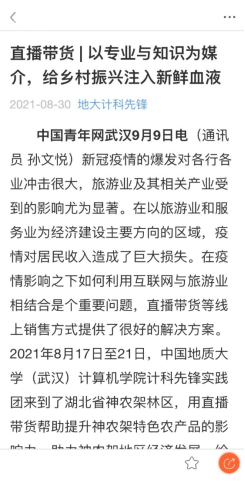 2021年,计科先锋实践团队前往湖北省神农架林区,开展“长江+乡村振兴”社会实践活动,深入调研当地乡村振兴现状;挖掘神农架特色农产品,通过电商助农直播扩大宣传,两场直播总时长157分钟,观看人数达六百余人,直播间点赞数近10万,商品曝光5164次;依托专业知识,通过互联网与传统产业相结合,以大九湖国家湿地公园为试点开发旅游小程序,功能逐步完善,景区逐步覆盖,通过与当地文旅局和景区对接有望在测试稳定后投入使用。