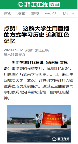 2020年,计科先锋宣讲团前往浙江嘉兴南湖,将具有特色的红色资源与专业知识相结合,通过开发智慧云党建小程序、在线直播云游革命圣地、尝试构建线上红色VR展馆、打造AR&VR红色教育平台等方式,重温中国共产党走过的峥嵘岁月,提升大学生对红色精神的学习,走出一条红色传承之路。