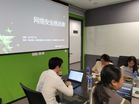 到达绿盟科技有限公司后,绿盟科技产品交付总监舒民对老师同学们表示热烈的欢迎,并带领大家参观了公司主要研发场所。在会议室座谈环节,绿盟研发经理何元基、产教经理彭元、袁帅等人向同学们介绍了公司概况、成人影院和主要项目,并就公司近期即将举办的“网络安全挑战赛”赛制进行了详细介绍。