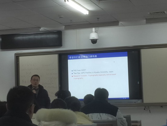 程池老师在开讲前贴心地为学生准备了纸和笔,引导学生养成良好的习惯,手脑并用。在讲授“信息安全数学基础”的勾股数部分时,他不断设定问题、抽丝剥茧,循循善诱,引导学生除了掌握基础知识,还要学会怎样解决一个小问题”;通过讲授密码学特别是最近新一代抗量子密码学的进展,结合自己带领大三学生在行业顶会发表论文的经历,教育学生“志当存高远”,当“取法乎上,得乎其中”,切忌“随便搞搞就算了”。程老师始终面带微笑,但提问犀利,连续多个“为什么”,让课堂气氛略显“紧张”,不断将学生“逼”向思考的深处。