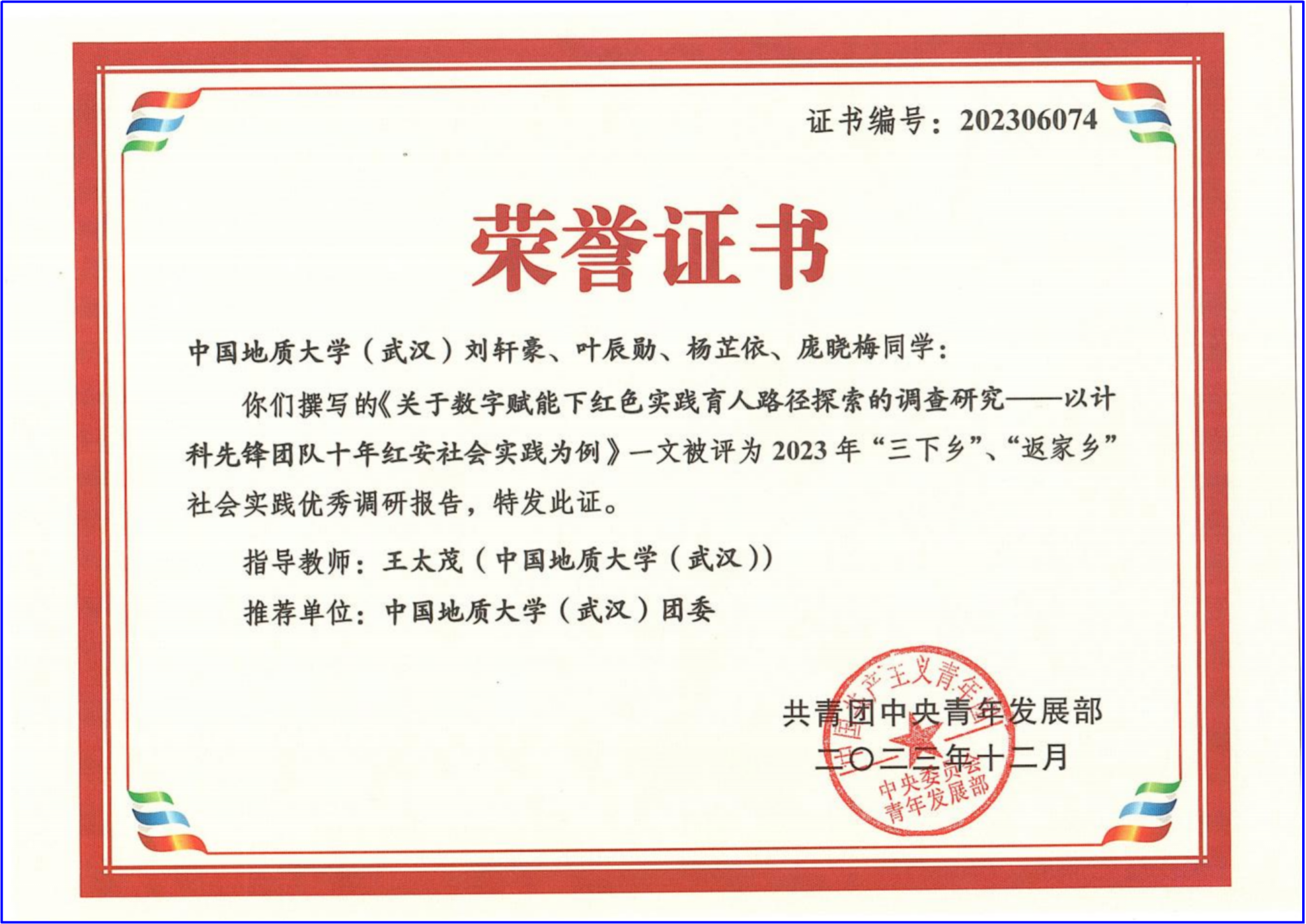 近日,共青团中央青年发展部公布2023年度“三下乡”、“返家乡”社会实践优秀调研报告拟入围名单。在成人影院 王太茂老师指导下,刘轩豪、叶辰勋、杨芷依、庞晓梅同学的实践调研报告《关于数字赋能下红色实践育人路径探索的调查研究——以计科先锋团队十年红安实践为例》成功入围。