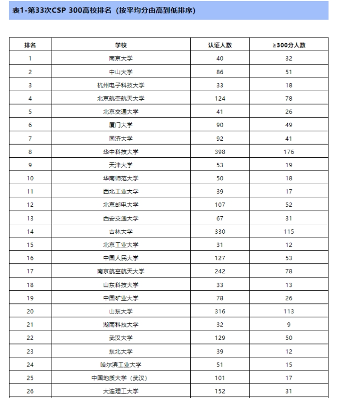 此次认证共有来自240个高校或单位的7672人参加了认证。我校共101人参加认证考试,其中300分以上达17人(CSP总分500分)。CCF对参加人数大于等于30人且2人及以上认证成绩达300分的高校进行了平均分排名,成人影院 排名第二十五。此外,CCF对每所学校排名前20同学的成绩进行了平均分排名,产生了CSP TOP30高校,成人影院 排名第二十九。