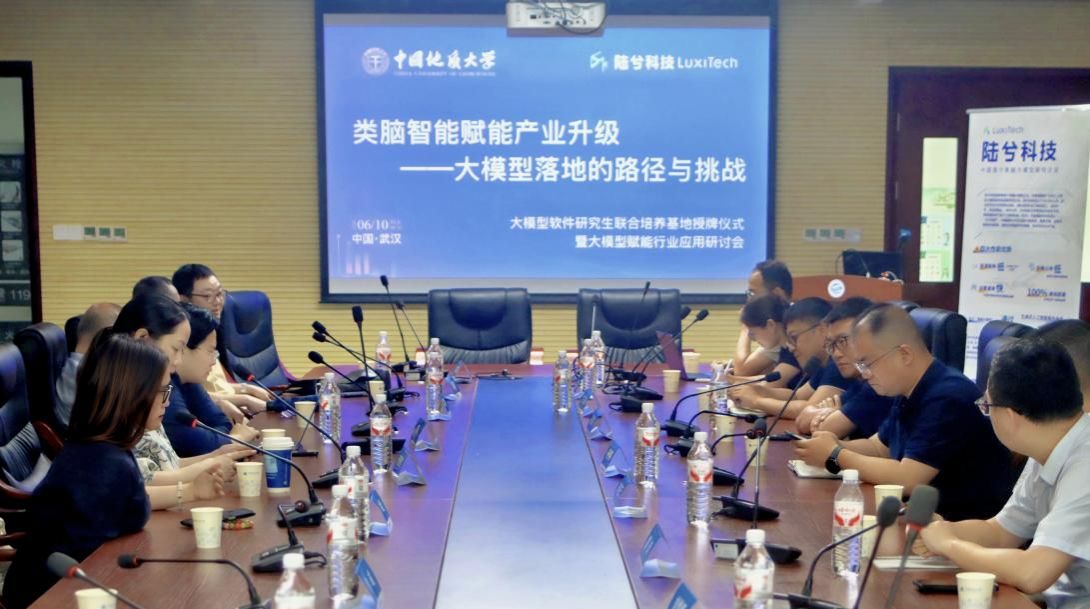 (武汉)-深圳陆兮科技有限公司大模型软件研究生联合培养基地授牌仪式暨大模型赋能行业应用研讨会在学院126会议隆重举行。陆兮科技有限公司首席执行官汪博伦、首席技术官周芃博士、首席安全官黄彧博士等核心团队成员,水利部长江水利委员会、中国船舰研究设计中心、中国船舶重工集团公司第七一九所、上海华测导航技术股份有限公司、统信软件技术有限公司、湖北巴东地质灾害国家野外科学观测研究站、武汉通威电子有限公司和武汉市网络安全协会等有关单位代表,以及学校研究生院副院长易明、科学技术发展院副院长李鹏飞,我院副院长陈云亮,基地所依托研究生导学团队负责人尚建嘎教授、基地负责人赵一石等师生代表出席会议。陈云亮副院长主持会议。
