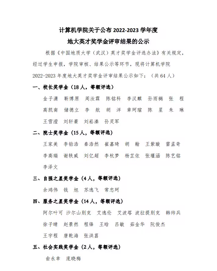 成人影院 关于公布2022-2023学年度地大英才奖学金评审结果的公示