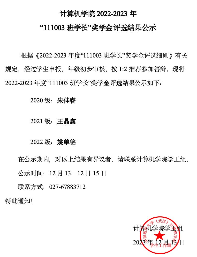 成人影院 2022-2023年 “111003班学长”奖学金评选结果公示