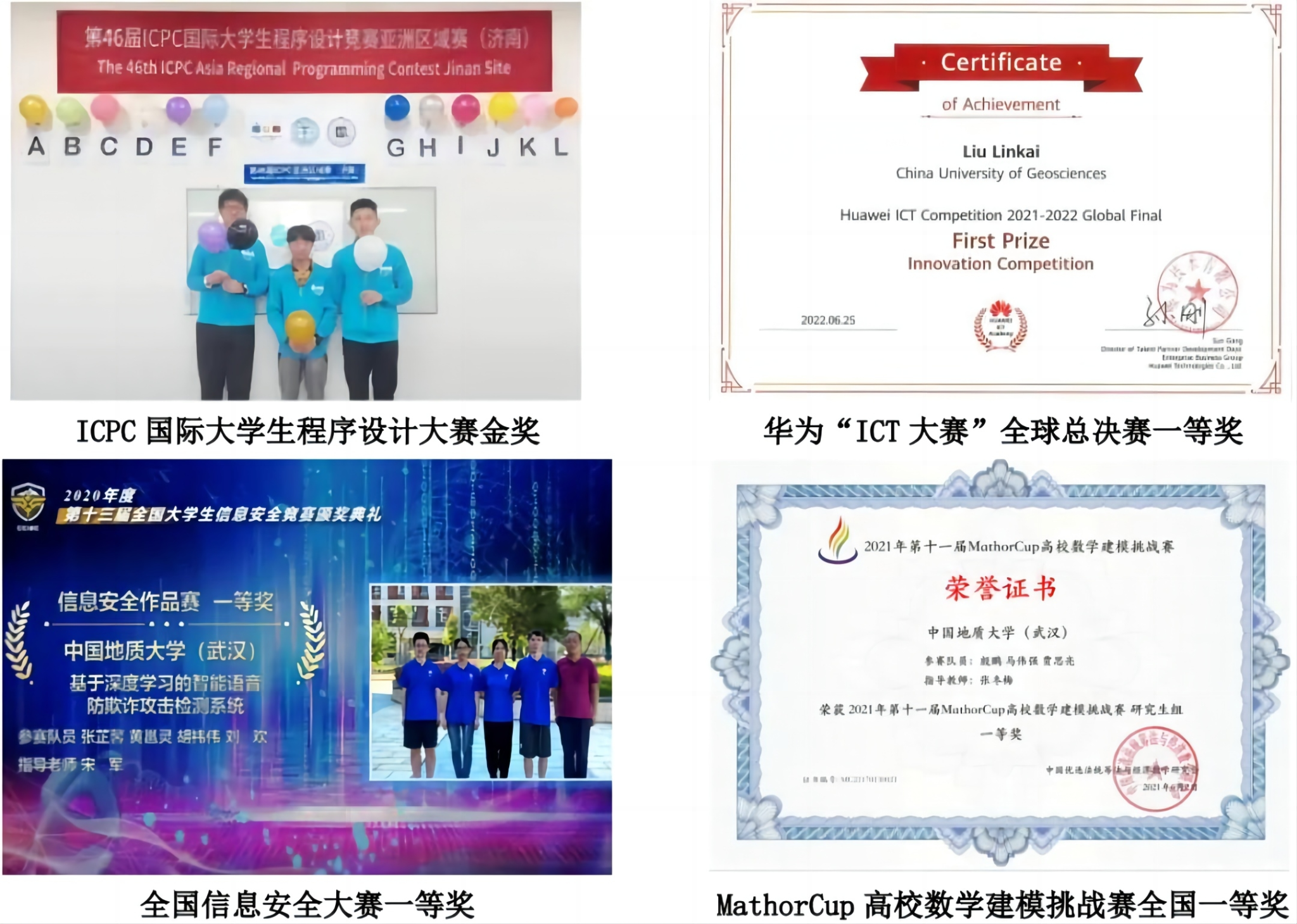 学院探索IT人才培养新模式,积极开展专业实践系列活动,力争培养出更多的创新人才。承办了多届全国高校移动互联网应用创新大赛,华中地区程序设计邀请赛等高水平科技赛事;组织学生参加ACM-ICPC国际大学生程序设计竞赛、全国计算机仿真大赛、全国大学生信息安全竞赛、全国高校移动互联网应用开发创新大赛等一系列国内外高水平赛事。近三年,学院在国内外创新创业大赛中获国家级及以上奖项274项,包括国际级一等奖9项、国家级一等奖52项、二等奖75项。其中,2023年获得美国大学生数学建模竞赛一等奖,第十三届“挑战杯”中国大学生创业计划竞赛国家级银奖,“地质+”大学生创新创业大赛国家级银奖,2022年获得“华为ICT大赛”全球总决赛一等奖,2021年获得ACM-ICPC亚洲区域赛金奖。