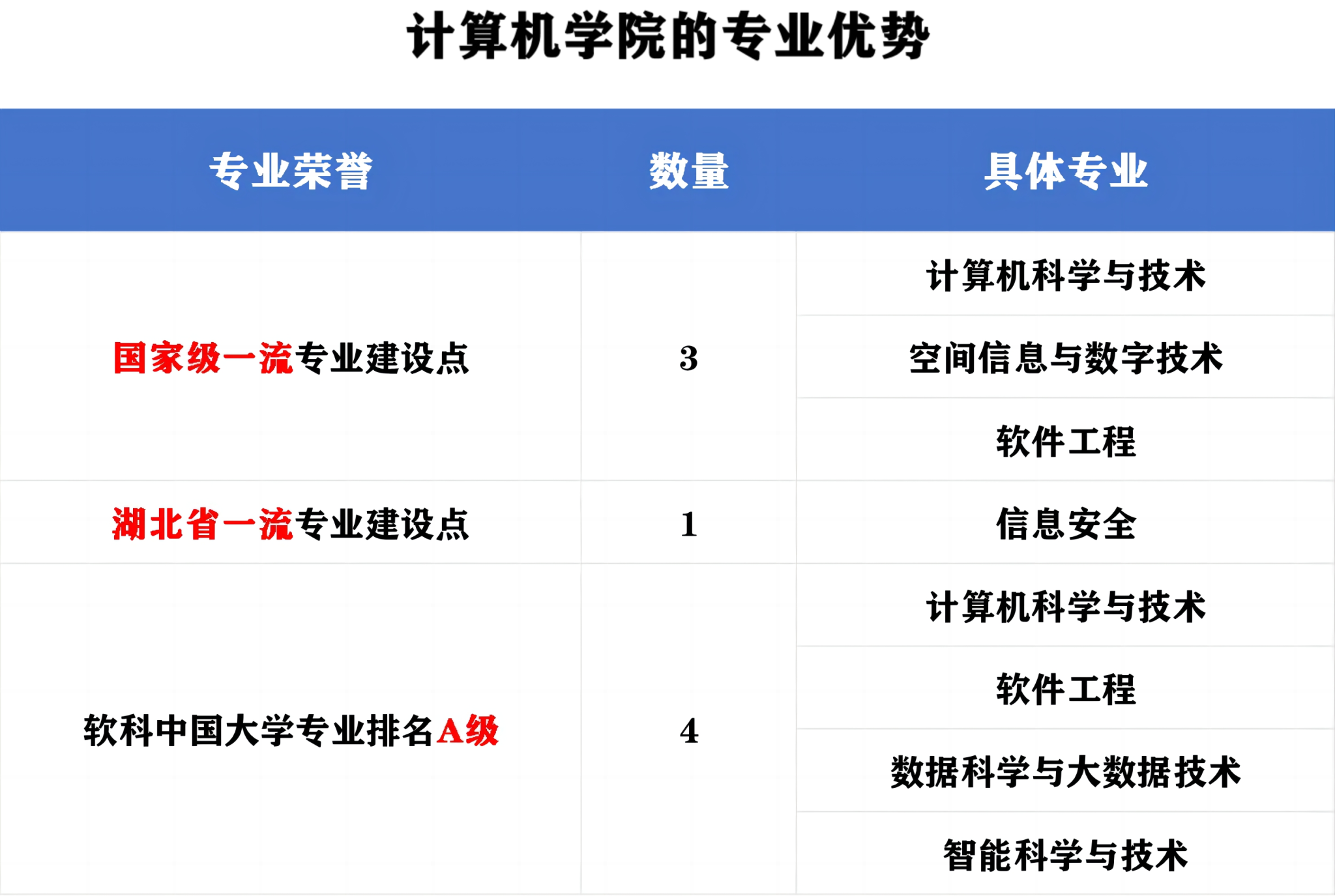 学院现有计算机科学与技术、信息安全、空间信息与数字技术、数据科学与大数据技术、智能科学与技术、软件工程6个本科专业和计算机科学与技术(大数据方向)中美合作办学专业。其中,计算机科学与技术、软件工程、空间信息与数字技术入选国家级一流本科专业建设点,信息安全入选湖北省一流本科专业建设点。在2023年的软科中国大学专业排名中,计算机科学与技术、软件工程、数据科学与大数据技术、智能科学与技术均被评为A级。