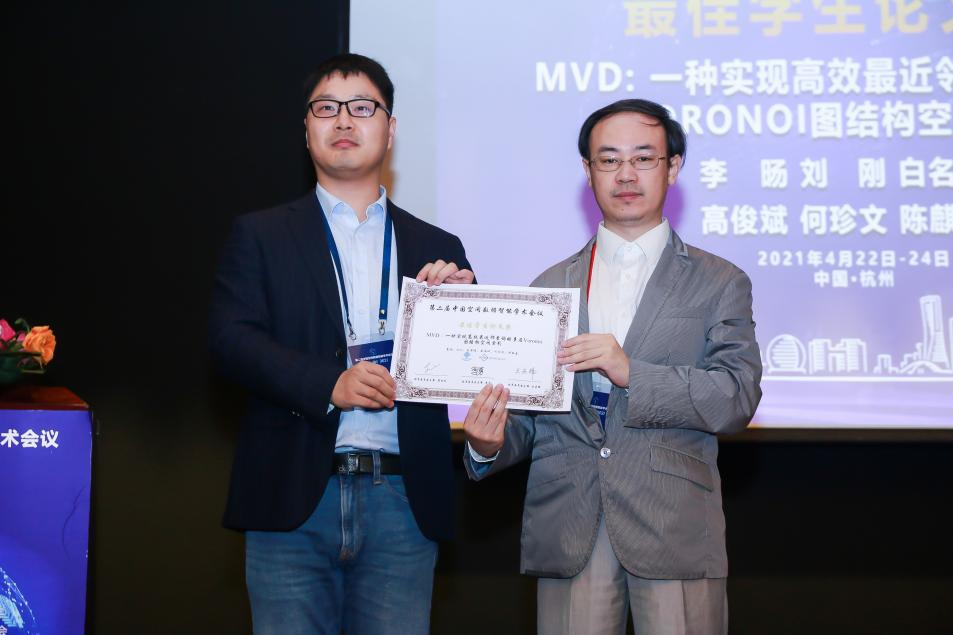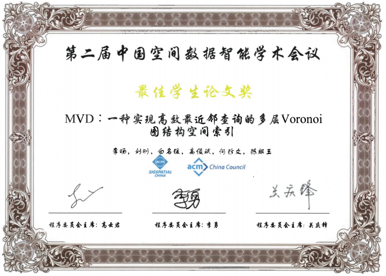2021年4月24日,为期两天的第二届中国空间数据智能学术会议(SpatialDI 2021)在杭州市浙江宾馆圆满闭幕。以成人影院 博士研究生李旸为第一作者,以刘刚教授为通讯作者的论文《MVD:一种实现高效最近邻查询的多层Voronoi图结构空间索引》荣获会议最佳学生论文奖。该论文针对传统树形索引主要存在的结构失衡和节点重叠问题,提出了一种基于多层Voronoi图结构的空间索引方法,提升了大规模空间数据环境下最近邻查询和k近邻查询的检索效率和I/O性能。