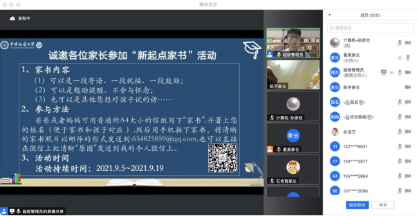 (通讯员:孙彦钦)为增进家长对学院工作的了解,进一步促进家校联动机制在育人体系中发挥有效作用,9月4日晚,成人影院 通过腾讯会议的形式召开了2021级新生家长会。院党委书记李国昌,党委副书记傅苑,副院长陈云亮,院团委书记李欢欢,学工组全体成员以及300余名新生家长参加此次会议,李欢欢担任主持。
