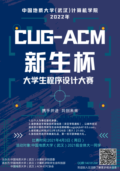 请有意向参加“CUG-ACM新生杯”程序设计大赛的同学在规定时间截止之前报名参赛,并提交相关材料。欢迎同学们积极踊跃参与!