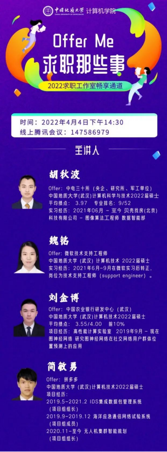 (通讯员:顾伟超、崔祥森)为帮助广大学生提升求职能力,熟悉求职面试技巧,成人影院 于4月4日举办“Offer Me”求职经验分享活动。本次活动邀请到4名已经签约就业单位的2019级硕士研究生:胡秋波、魏铭、刘金博和简敏勇,在线分享求职经历与经验体会,全院近200名同学参加活动。
