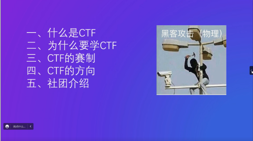 网络安全协会负责人邰霄同学进行网络安全协会介绍与CTF赛事介绍