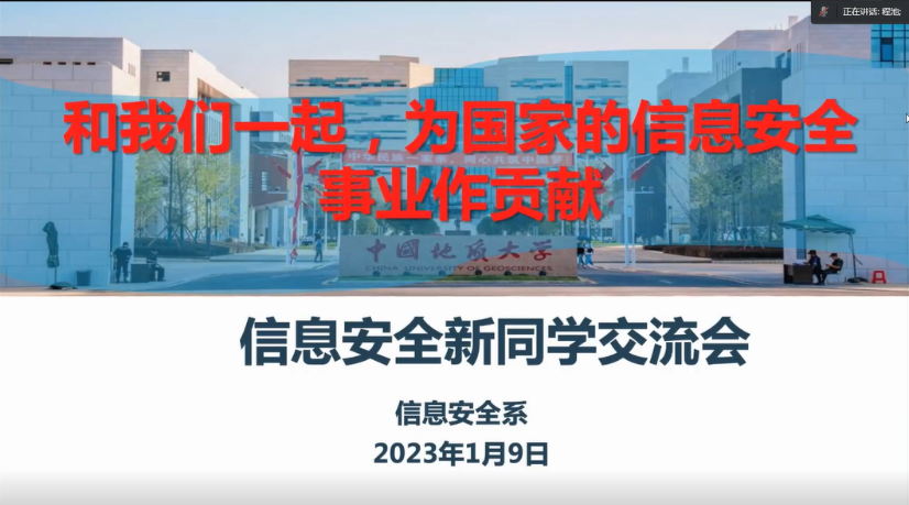 信息安全系系主任程池老师带来信息安全系的专业介绍,与同学们分享如何参与科研实践活动的方式与经验,展示了2023届的优秀学生的发展路径,代表信安系全体老师欢迎同学们与各位老师沟通交流,一起为国家的信息安全事业努力。希望大家在接下来的学习中,既要学好专业知识,同时也体会奋斗的喜悦;功不唐捐,即使失败也是非常宝贵的经历。
