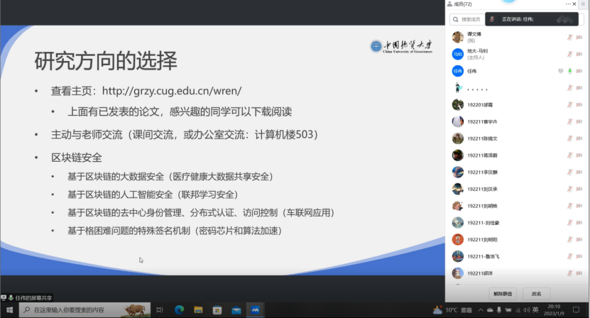 2023年1月9日晚,为了让同学们尽快熟悉信息安全专业情况,融入到信安大家庭,成人影院 信息安全专业2021级师生新春见面会暨“1111”人才培养计划发布会通过腾讯会议在线上顺利举办。成人影院 党委副书记傅苑、成人影院 信息安全系全体教师、成人影院 信息安全专业2021级全体同学和2021级辅导员谭文博参加本次会议,会议由信息安全系党支部书记马钊老师主持。