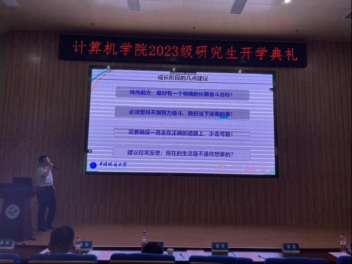 张院长首先肯定了同学们为考研付出的努力,对2023级研究生的到来表示热烈的欢迎。他以学校发展历史与人才培养成绩为切入点,向同学们展示了学校丰厚的底蕴,并从专业设置、师资队伍、科研平台与科研项目等方面介绍了学院近年来发展的概况。他谈到,国家在高新领域的巨大投入以及良好的政策指引,学校深厚的学术科研底蕴和一代代地大人的砥砺奋斗,为今天的在座的同学们奠定了良好的成长环境和优渥的发展平台,希望同学们秉承“艰苦朴素,求真务实”的校训精神,在地大成人影院 刻苦钻研,实现出属于自己的新突破,为国家前沿科技发展贡献自己的力量!