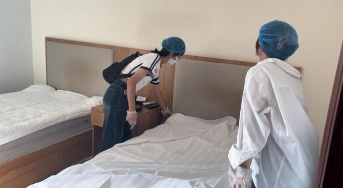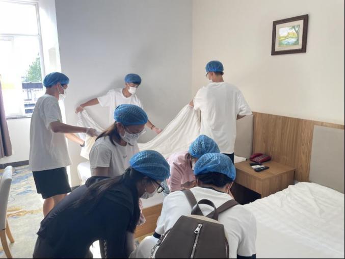 第二组学生在工作人员的带领下齐聚悦宾楼,8人一组,每组一位工作人员示范,大家一起铺床、叠被子、折天鹅,争先恐后、挥汗如雨,大家收获了技能,收获了鼓励,融入了集体,开始了奋斗。