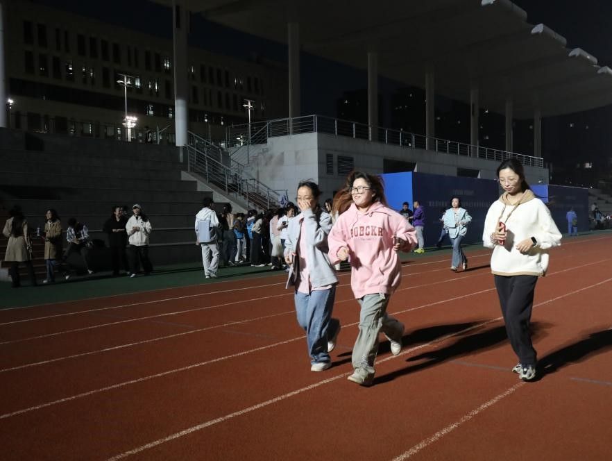 活动伊始,现场气氛热烈非凡。18:30刚过,师生们来到操场签到入场,领取荧光手环后,纷纷与伙伴拍照打卡,记录这一美好时刻。19:00,热身环节开启,动感的音乐响起,大家跟着节奏尽情舞动,迅速摆脱了“开学瘫”,为接下来的运动做好准备。
