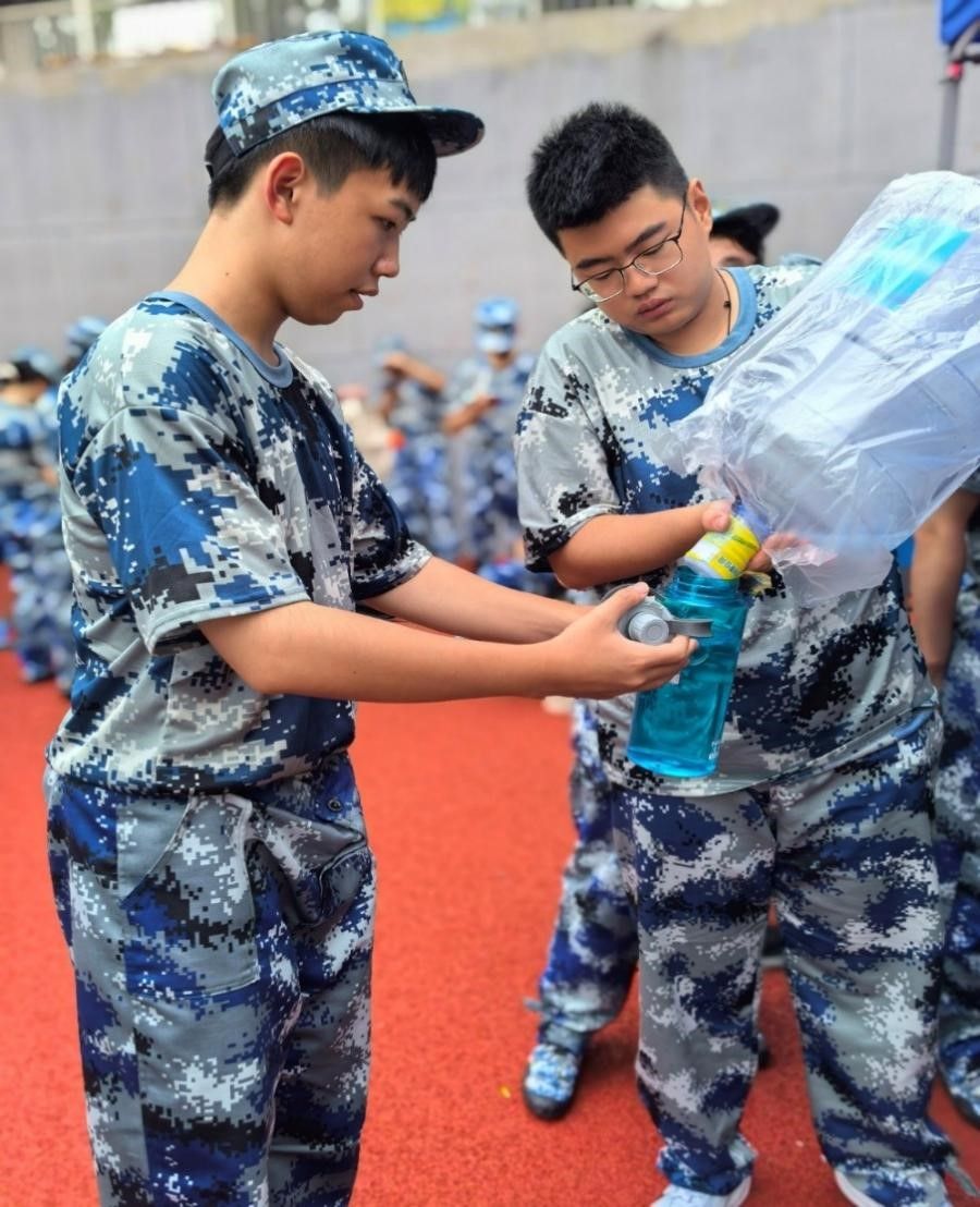消防安全教育亦是军训的重要一课。学校专门组织了消防灭火实操演练,同学们逐一上手实践。这场沉浸式演练有效提升了学生的消防安全意识和应急处置能力,为巩固校园安全防线奠定了坚实基础。