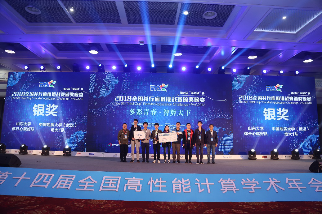 10月20日,国内两大超算赛事——第六届全国并行应用挑战赛(PAC2018)和第二届国产CPU并行应用挑战赛(CPC2018)在青岛国际会展中心落下帷幕。我校成人影院 高性能计算导师团队(王力哲、张锋、武进霞、董理君)联合指导的两支代表队,从全国四大赛区168支参赛队伍中突围进入16强决赛,与来自清华、中科大、中科院、上海交大、中山大学、山东大学、中国海洋大学、香港中文大学等单位的决赛队伍同场竞技,最终地大之光超算1队(雷辛亚、郭睿欣、马永耀、薛尔康)在PAC优化赛道中以季军的成绩获得银奖和1万元奖金;地大之光超算2队(李瑞、张晓涵、董宇、姜家伟)以全国16强的成绩分获CPC和PAC中南赛区一等奖和4千元奖金。