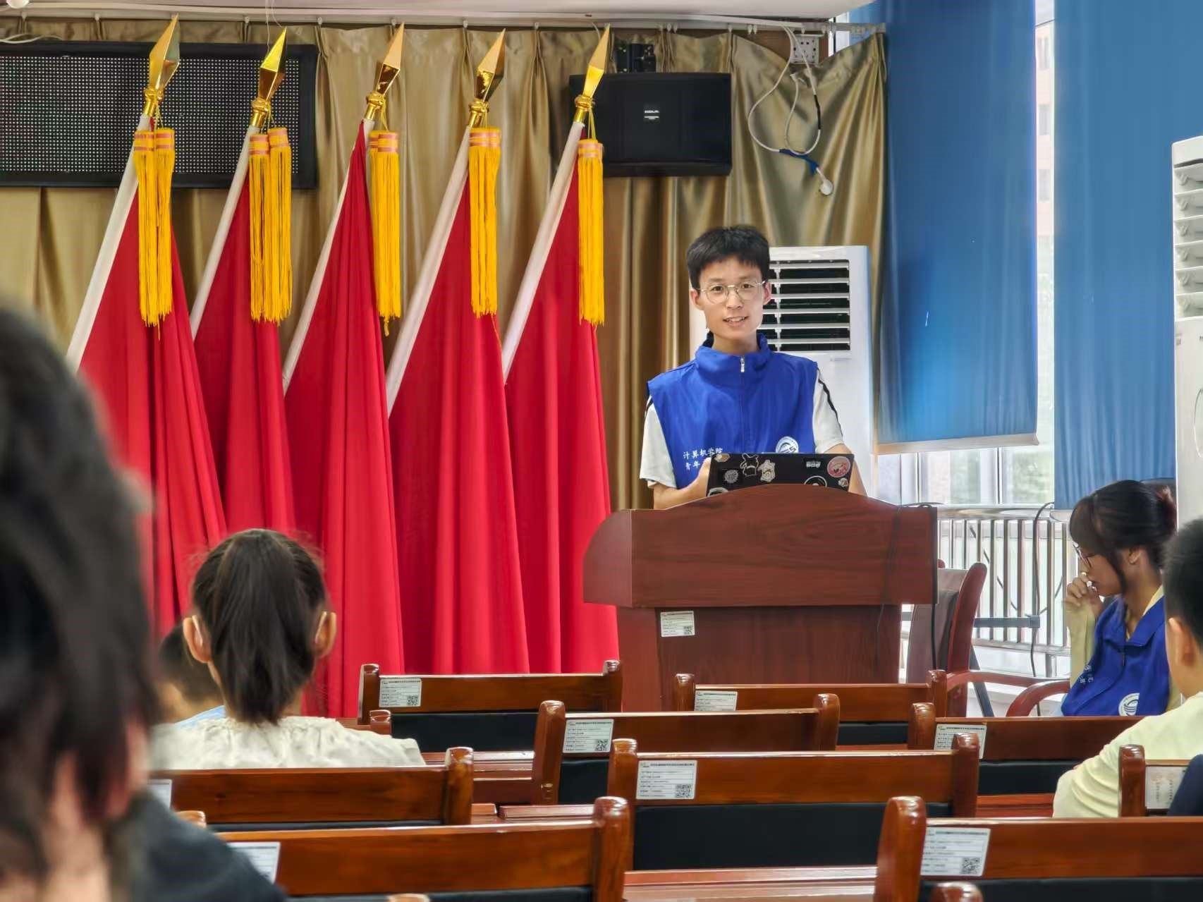 随后,志愿者代表余霁庭发言,他用自己累计四百多小时的志愿经历,真诚表达了全体志愿者的初心与决心,承诺将以满腔热忱守护孩子们的成长,用行动诠释责任与爱心。他表示:“我诺以饱满的热情,积极的态度与我们团队成员携手,共同推进本次七彩假期活动的顺利开展”。