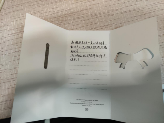樊媛媛老师:收到同学们的贺卡很开心,也很惊喜。今天教师节,我借此勉励自己。在教师节收到贺卡是对我的工作最大的肯定了。平时管你们很严,也是怕你们走弯路,大家还是一定要好好学习,好好上课。