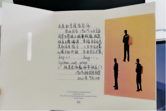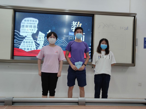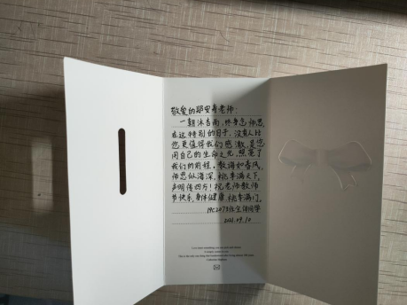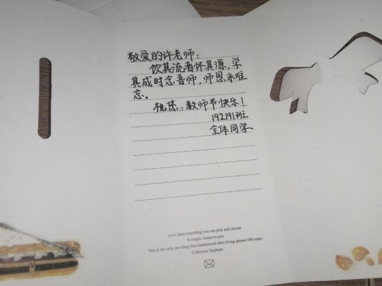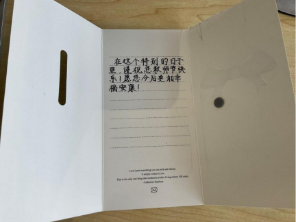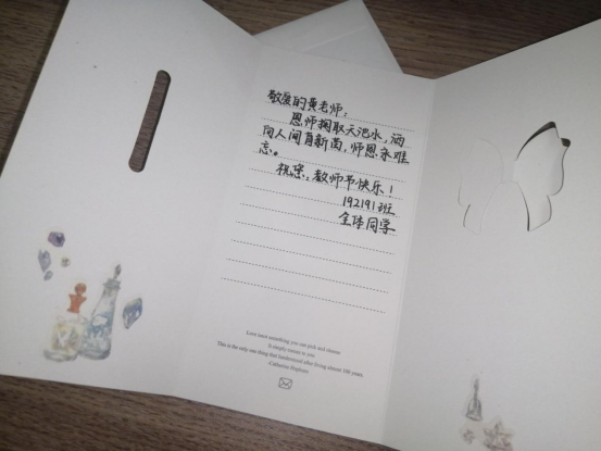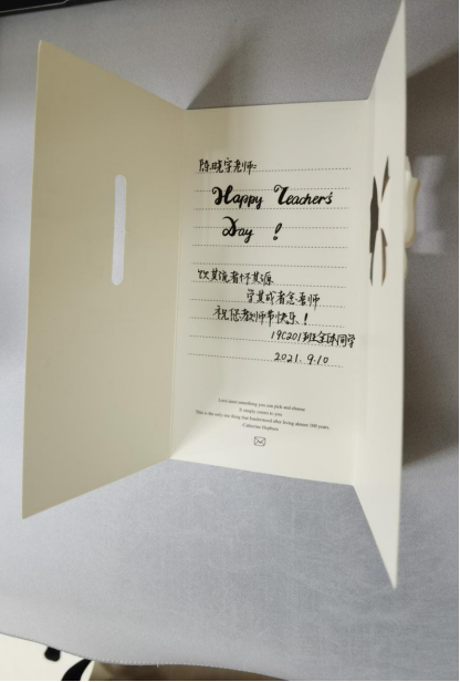 陈云亮老师:首先就是感动,听到同学们对我的祝福,看到同学们给我送的花束与贺卡,身为一名教师,我感到无比的自豪。真的十分感谢同学们对我的祝福,为了不辜负大家期望,我愿用更加饱满的热情上好每一堂课,用更为亲切的关怀对待每一位学生。我也祝各位同学身体健康,学业有成。