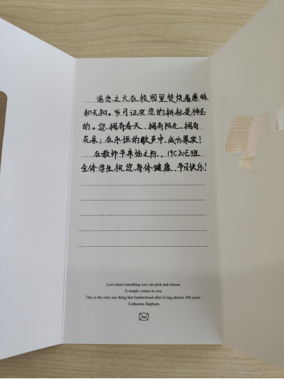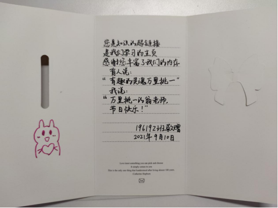 郑安寿老师:虽然只是一份贺卡和几句祝福,但还是真心的觉得高兴和欣慰。这样的活动也增进了师生间的情谊。很感谢同学们送来的祝福和礼物,谢谢大家。希望之后我们共同努力,共同进步。也希望每一个充满着希望和梦想力量的大学生,都能够好好规划自己的人生,青春无悔。胸怀天下,脚踏实地,时间和努力会塑造更好的自己。坚持向前,努力拼搏,为美好的未来而奋斗。