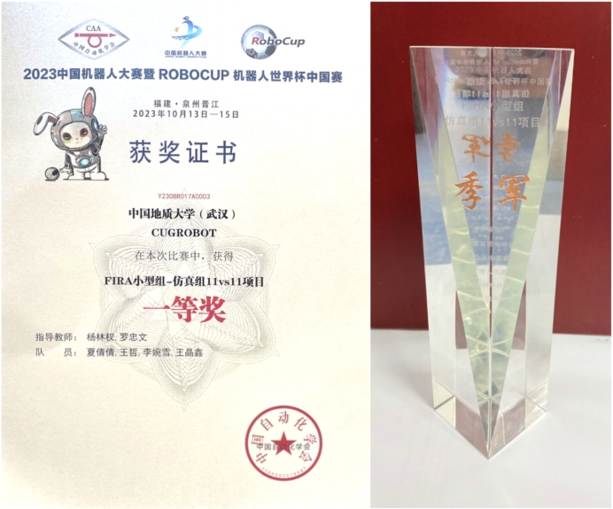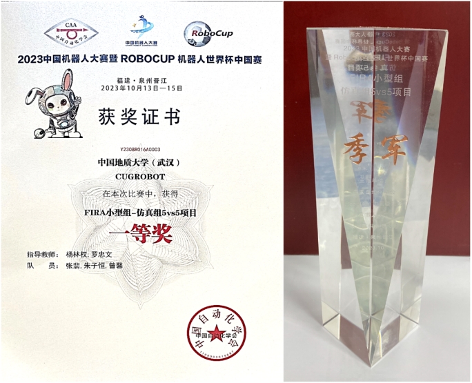 2023年中国机器人大赛暨RoboCup机器人世界杯中国赛(以下简称:中国机器人大赛)落下帷幕,成人影院 CUGROBOT代表队参加。经过激烈角逐,杨林权、罗忠文两位老师带领研究生张翡、夏倩倩和本科生朱子恒、王哲、曾馨、李婉雪、王晶鑫获得FIRA仿真组5vs5项目季军、一等奖,FIRA仿真组11vs11项目季军、一等奖。比赛过程历历在目,记忆犹新。