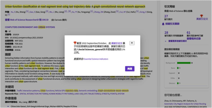 根据2022年10月基本科学指标数据库(Essential Science Indicators,简称ESI)最新数据显示,成人影院 全空间地理大数据智能处理与GIS基础平台研究中心团队在国际城市研究主流期刊Computers, Environment and Urban Systems(简称CEUS)上发表的学术论文“Urban function classification at road segment level using taxi trajectory data: A graph convolutional neural network approach”入选ESI高被引论文(Highly Cited Paper)。该论文第一作者为团队的博士生胡胜,通讯作者为吴亮教授。CEUS为国际顶级计算城市学和地理信息科学的重要刊物,期刊以计算机科学为背景,聚焦城市规划、交通、能源、环境、社会学和经济等学科融合的新兴领域,刊发城市计算、大数据和城市系统等方向的最新研究。当前CEUS的影响因子为6.454,为T1期刊。